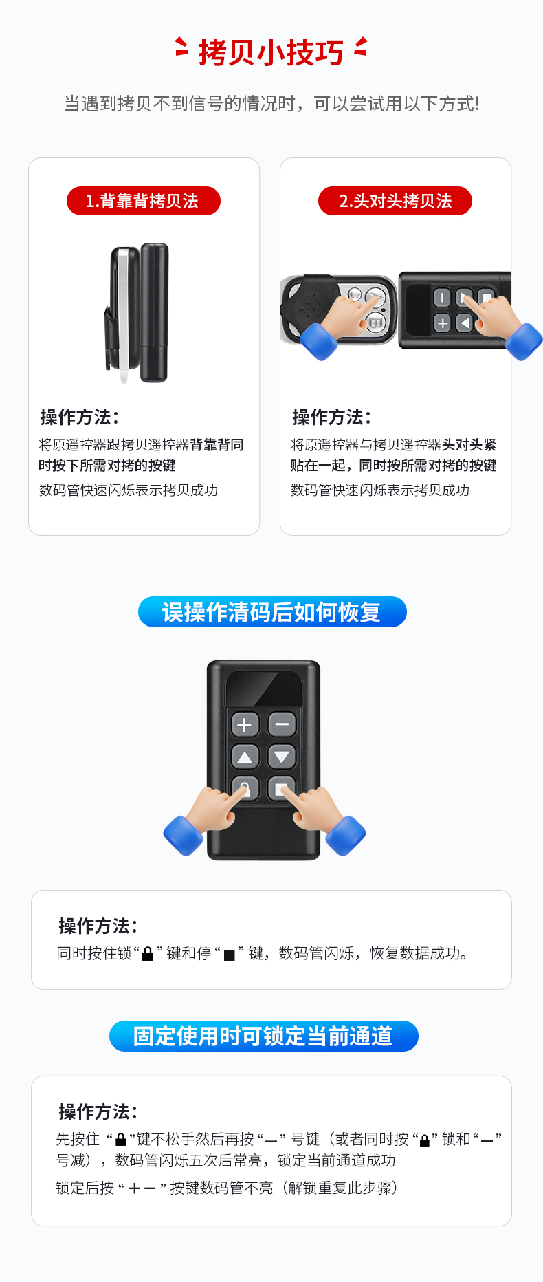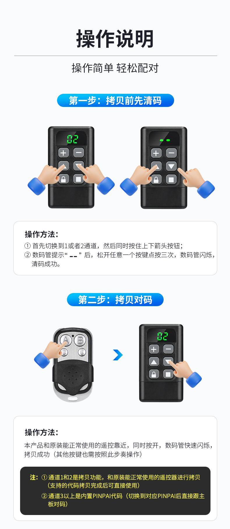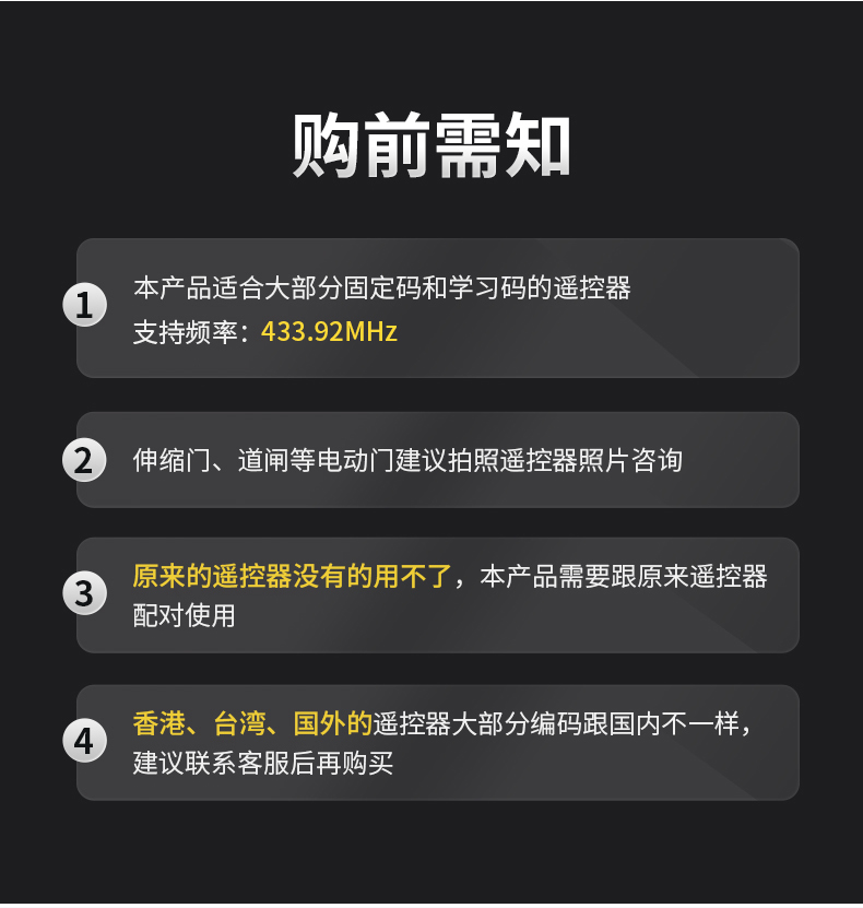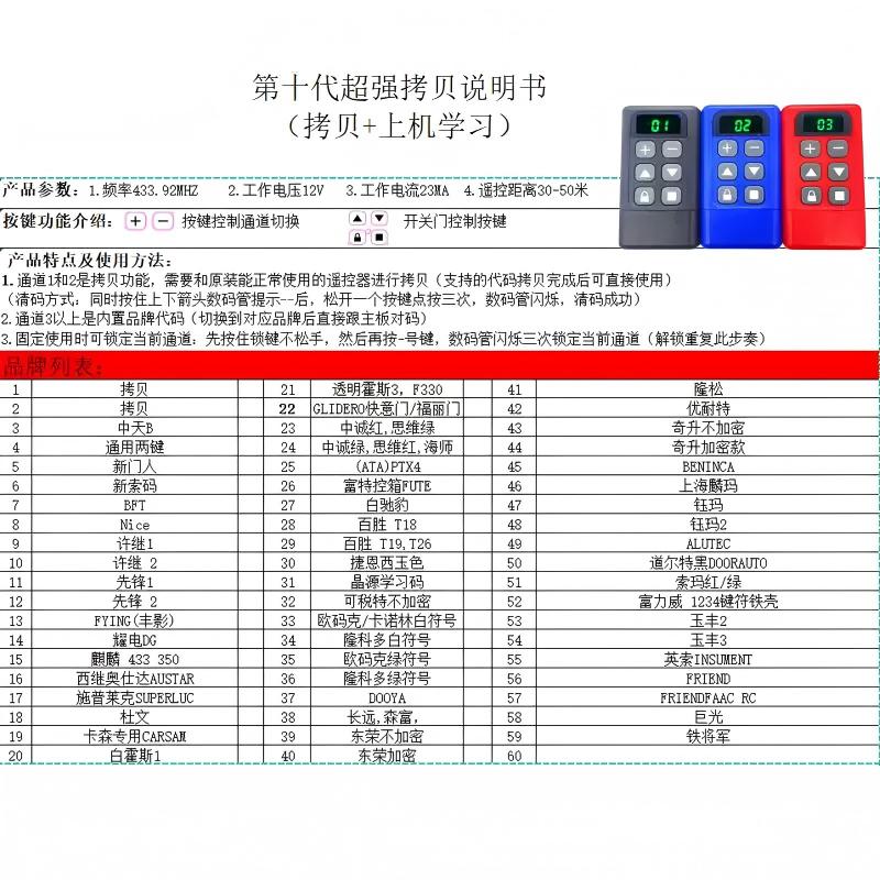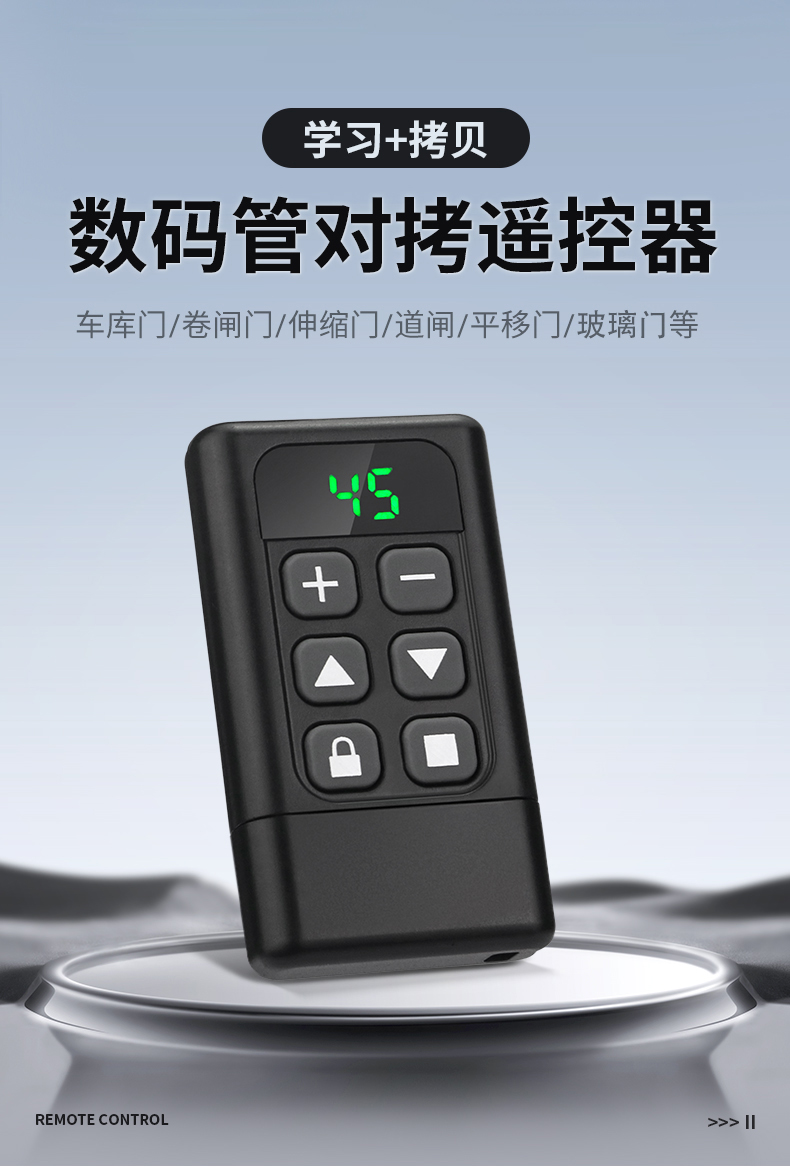 产品用途:适用于各种车库门、电动门、卷闸门、道闸等遥控器匹配增加!