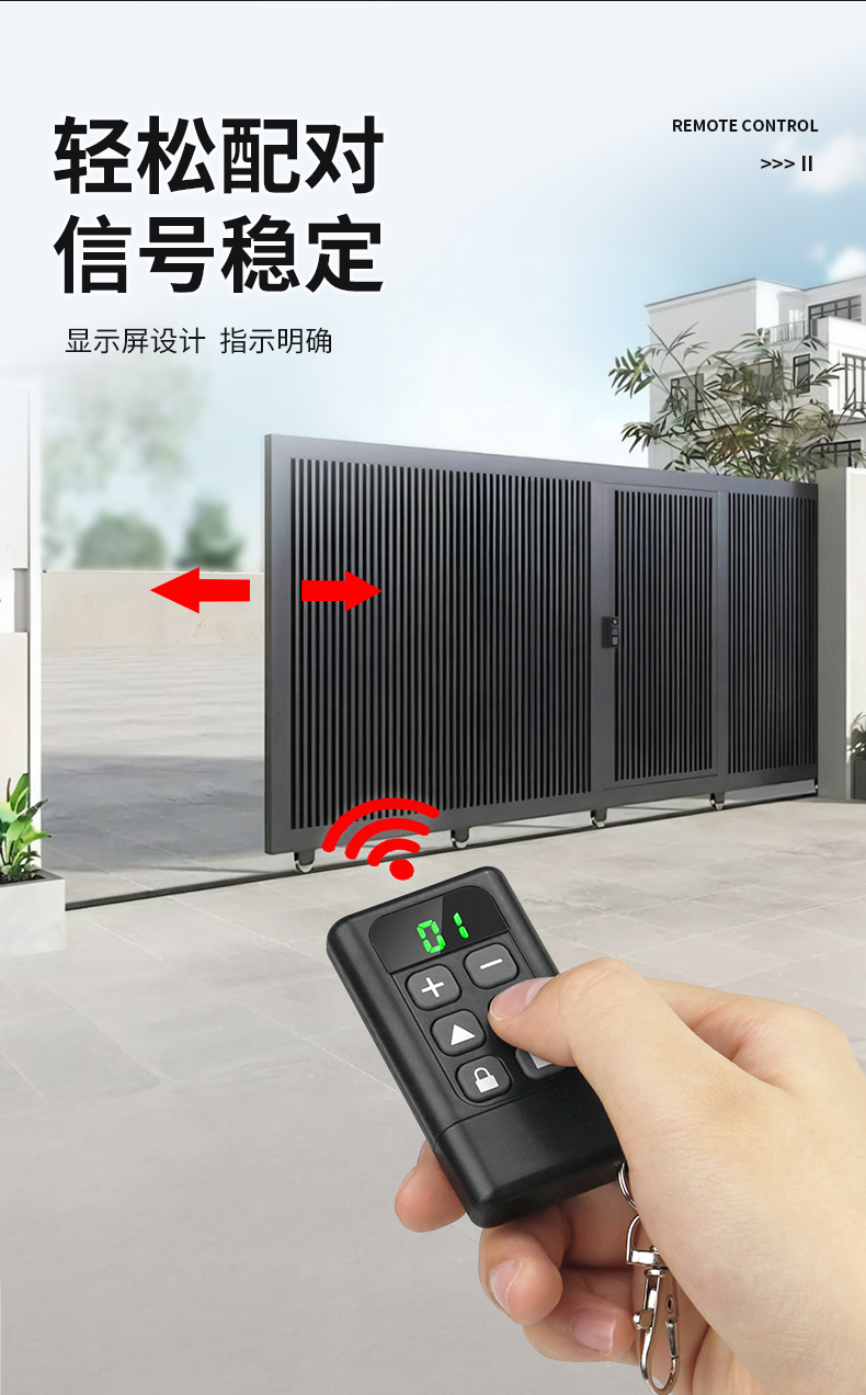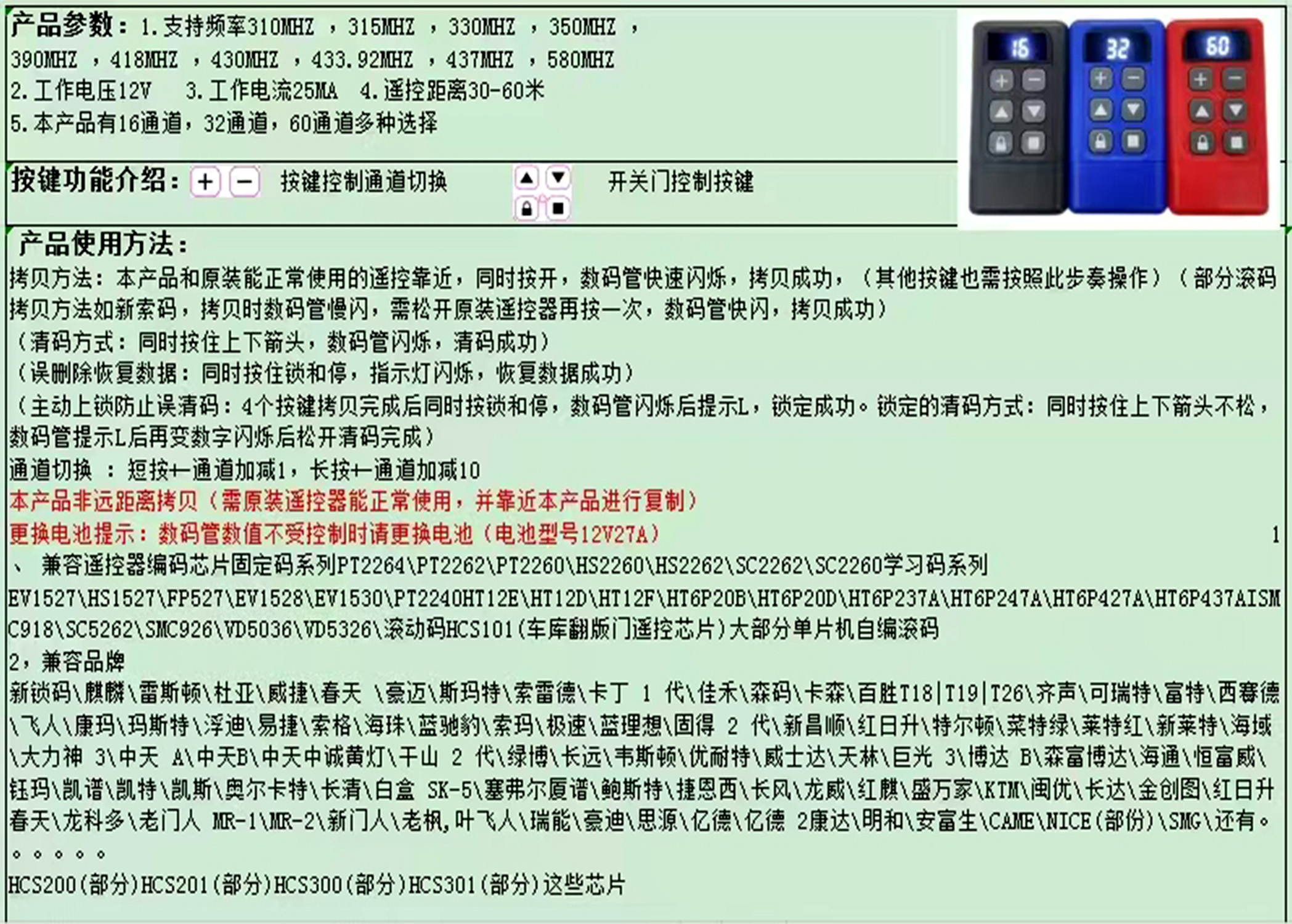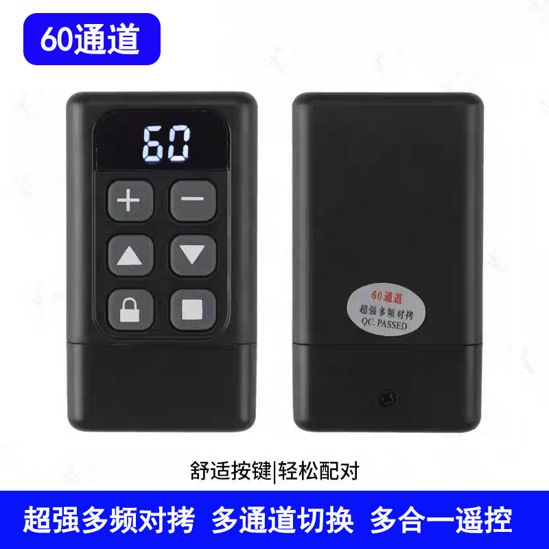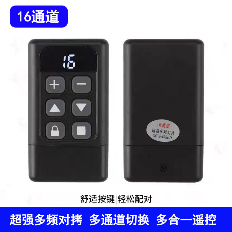 产品用途:适用于各种车库门、电动门、卷闸门、道闸等遥控器匹配增加!