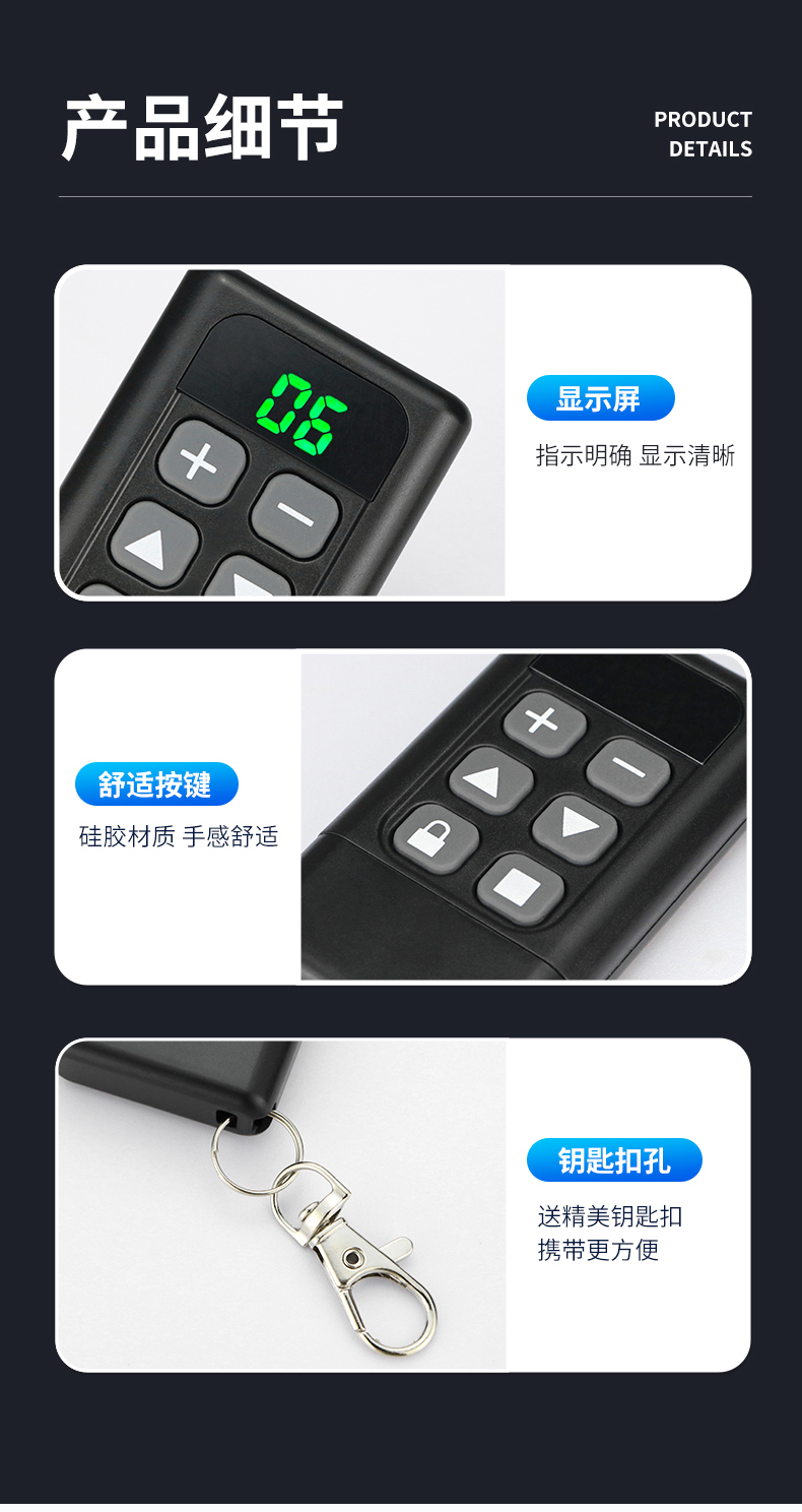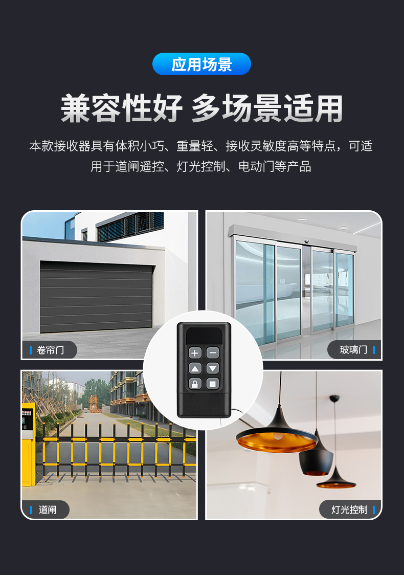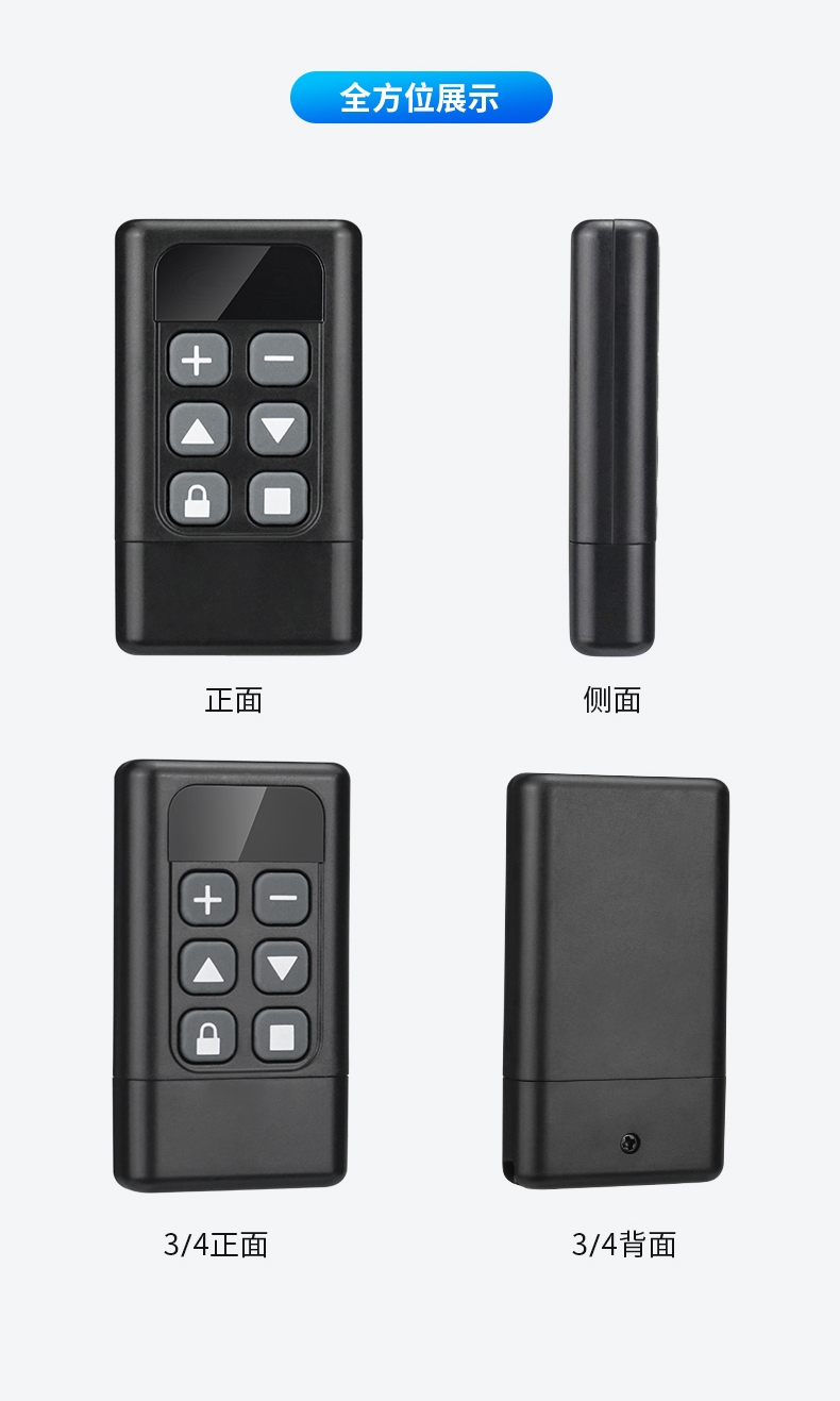 产品用途:适用于各种车库门、电动门、卷闸门、道闸等遥控器匹配增加!