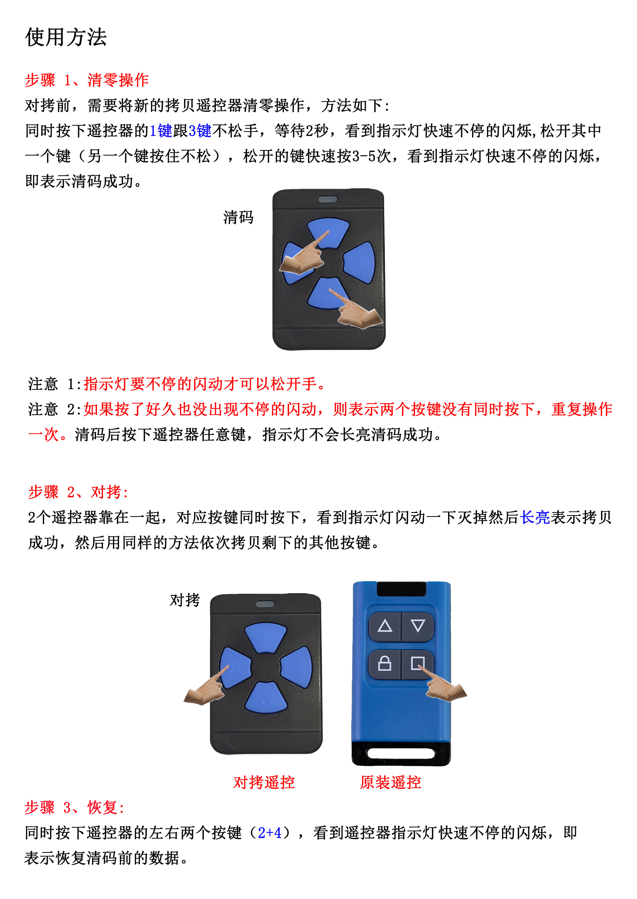 产品用途:适用于各种车库门、电动门、卷闸门、道闸等遥控器匹配增加!